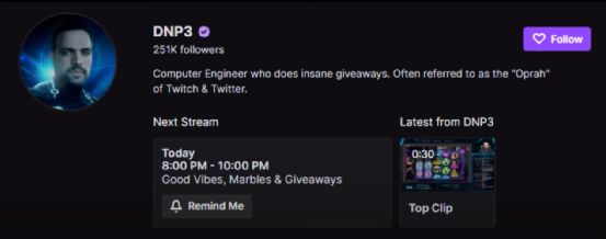但社交媒体的形象,是可以随意塑造的。大多数平台都存在着“买粉丝”,搞“僵尸粉”的现象。比如说前文提及的DNP3,就是最为明显的例子。DNP3的Twitch账户拥有着25万粉丝。但如果仔细翻看过往的信息记录,便能够意识到,他的粉丝们其实只是为了免费抽奖而来的。