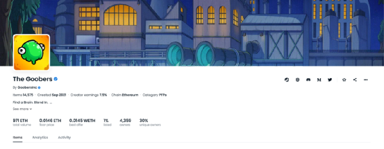 The Goobers项目于2021年9月创立,截至今日累计拥有4359名投资者。项目绑定虚拟货币以太坊,以此为链条创建的NFT物品数量为14575个。项目总资产为971以太坊,按照近期的汇率换算,总价值高达129万美元。