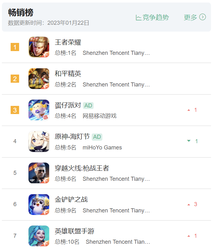 从畅销榜单上来看,腾讯的几大核心产品《王者荣耀》《和平精英》《英雄联盟手游》《金铲铲之战》《穿越火线:枪战王者》以及《QQ飞车手游》和《QQ炫舞手游》中,除了《王者荣耀》全部都是端转手产品。