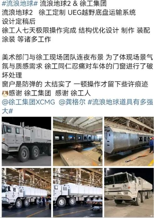 其中,光是徐工集团就免费赞助给剧组42款61台主机设备、400多套零部件和车间道具,以及61套三维模型和319名工作人员,并在长达半年的时间内为剧组做好了各方面的资源配置和保障。此外,电影中多次出现的外骨骼机器人则源于傲鲨智能的赞助;而部分月球场景和返回舱来自《独行月球》剧组,非洲场景则是“蹭”了《万里归途》……