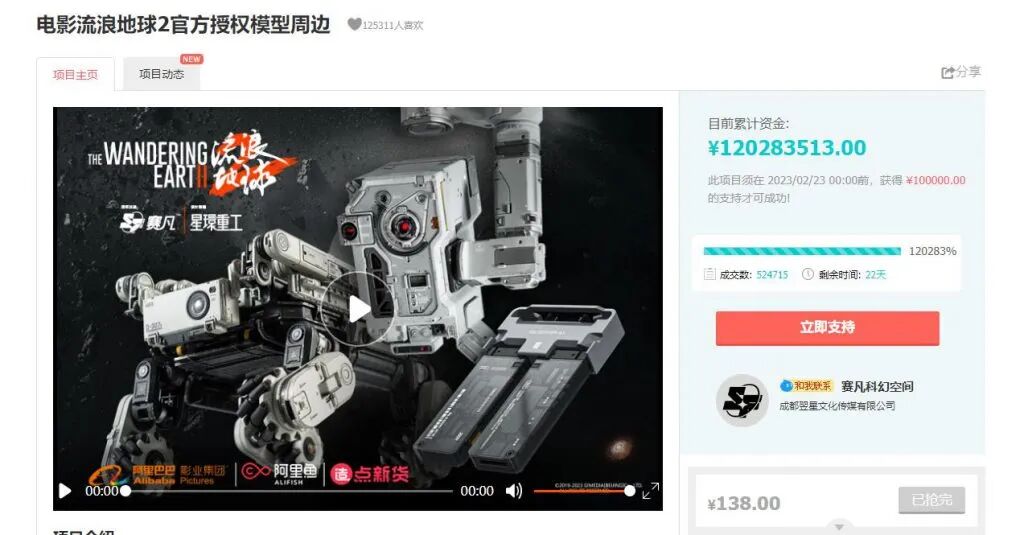 近日,随着《流浪地球2》电影斩获近30亿票房,官方周边众筹金额也突破1亿元,打破国内影视衍生品众筹金额纪录。