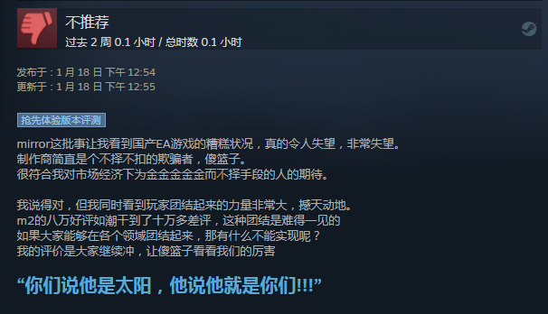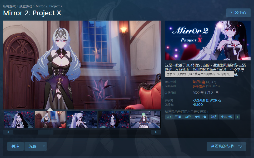 到这时,玩家才彻底回过味来,《Mirror2》永远不会有真正意义上的“转正”,也永远不可能补充他们喜闻乐见的的“涩涩”玩法,于是一场差评暴风雨便无可避免地呼啸而至。