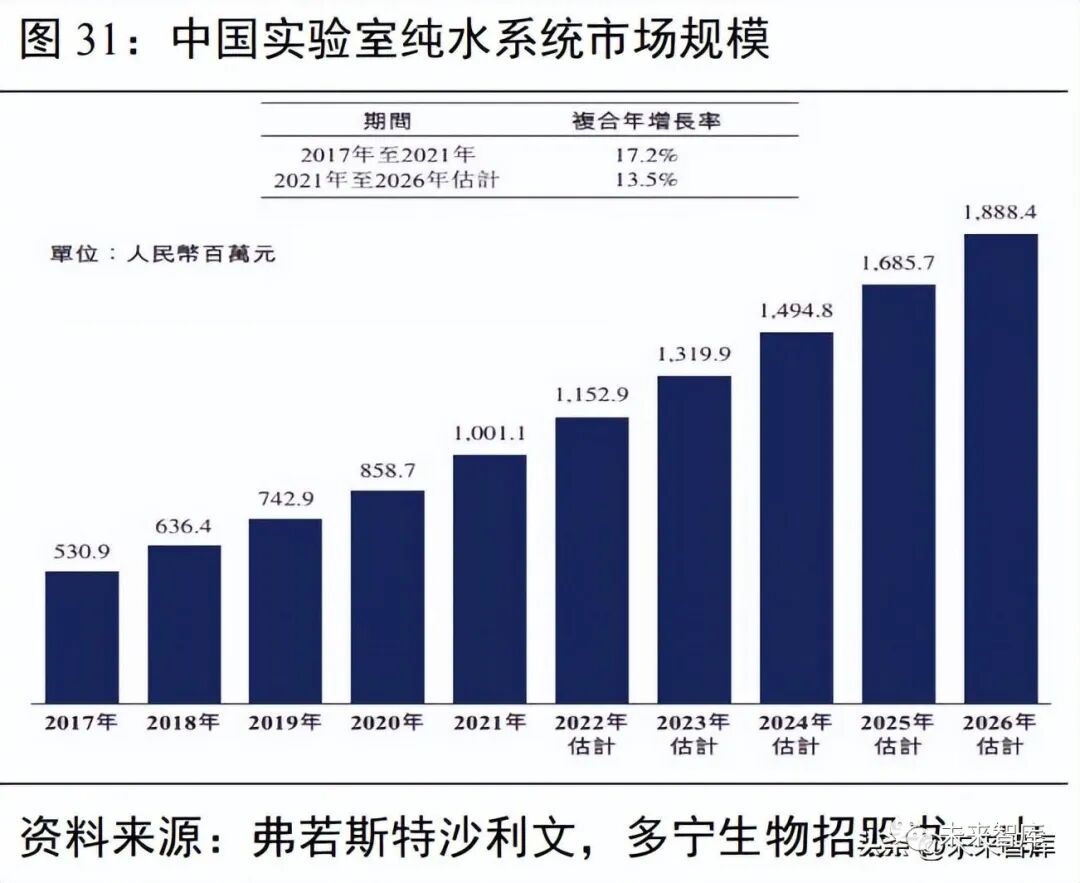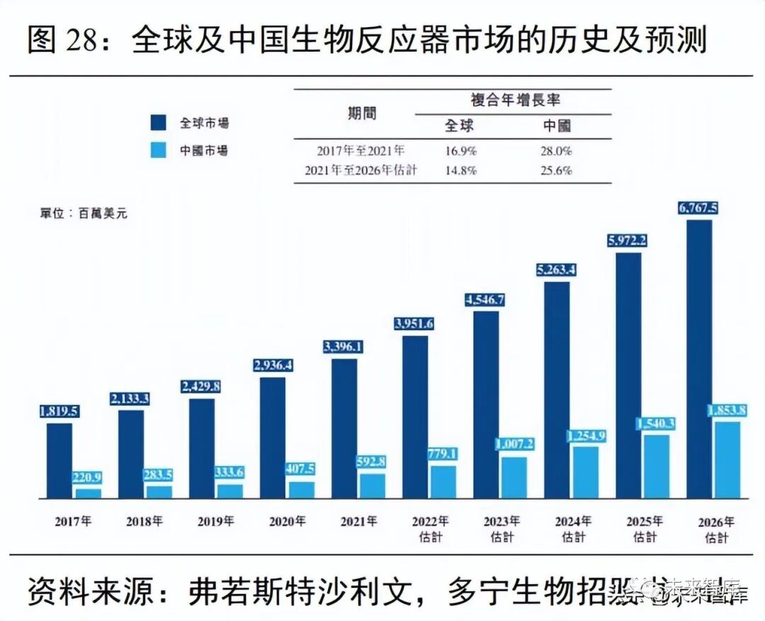 考虑到其余 R&D 经费支出占比 77%的企业对科研试剂的巨大需求,国内科研试剂市场规模将远超千亿元规模。在仪器耗材领域,根据 Markets and Markets 发布的《Laboratory Equipment Services Market by Type、 Contract、Equipment、Service Provider(OEM)and End User-Global Forecast to 2024》报告,全球科研仪器 市场容量预计将从 2019 年的 95 亿美元增长至 2024 年的 177 亿美元,CAGR 达 13.4%,其中亚太区份额占 比持续提升。根据《生命科学实验耗材市场及关键制造技术的现状、挑战与对策》,2018 年我国一次性科学 耗材的市场容量为 231.26 亿元人民币,预测未来年增长率为 20%。生命科学上游的产品,例如培养基、耗 材、反应器等,国内市场的预测增速均在 20%以上,但国产市占率在 20%~35%不等,国产替代空间巨大。