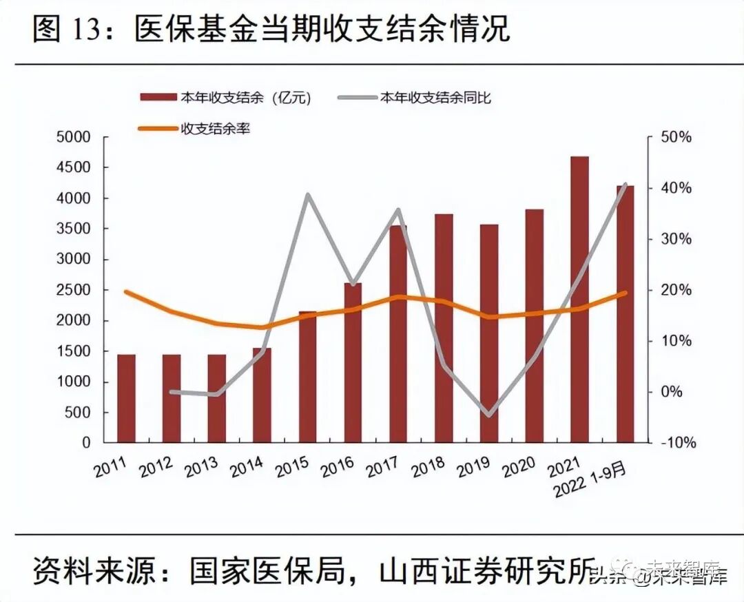 今年 1~9 月,全国医保基金(含生育保险,下同)总收入 21491.2 亿,同比增长 5.5%;总支出 17285.9 亿,同比下降 0.5%,主要是去年同期支付新冠疫苗及接种费用,本期相关支出大幅减少。1~9 月当期收支 结余率 19.6%,高于 2011~2021 年当期收支结余率均值 15.9%。年度数据看,2021 年全国医保基金总收入 28727.6 亿,同比增长 15.6%;总支出 24043.1 亿,同比增长 14.3%;基金当期结存 4684.48 亿,当期结余率 (当期结余/总收入)16.3%,高于既往十年平均结余率 15.9%;累计结存 36156.3 亿,同比增加 14.8%。
