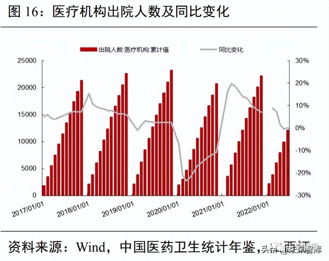 从医疗机构就诊情况来看,今年上半年医疗机构总的就诊人次(按月)与去年同期基本持平,但从病 床使用情况来看,2022 年好于 2020 年,但低于 2021 年,并且明显低于疫情前。医疗机构的诊疗活动并没有恢复如常。从手术人次数来看,2021 年恢复良好,与医疗机构出院和就诊 人次变化趋势比较符合。从医疗机构诊疗人次看,2022 年前 6 个月累计值与 2019 年同期相比减少了 24.18%, 从出院数据看,2022 年 6 月份累计值与 2019 年同期累计值相比减少了 4.8%,疫情仍然对医院总的诊疗活 动产生了影响,手术需求相对刚性,影响偏小。