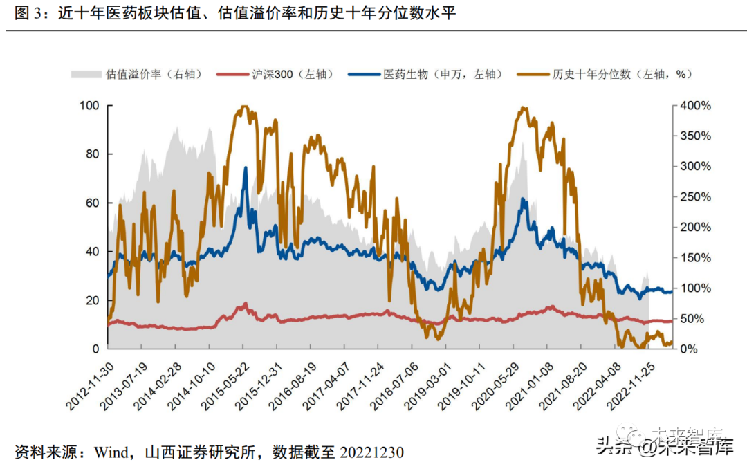截至 12 月 30 日,申万医药指数整体估值(TTM)为 23.4 倍,相对沪深 300 溢价率为 106.8%,位居历 史十年分位数的 4.7%,历史十年医药板块绝对估值的中位数为 38.0,均值为 38.3,医药板块的估值、估值 溢价率、历史十年分位数均处在比较低的水平。从子板块的估值水平和历史十年分位数来看,医疗服务、医疗器械、生物制品的估值水平最低。医疗 器械、医疗服务、生物制品的历史十年估值水平分位数在历史极低水平,主要与疫情相关的检测、耗材、ICL 等业务带来较高的利润水平,以及 CXO 板块新增订单带来的利润高增长有关。