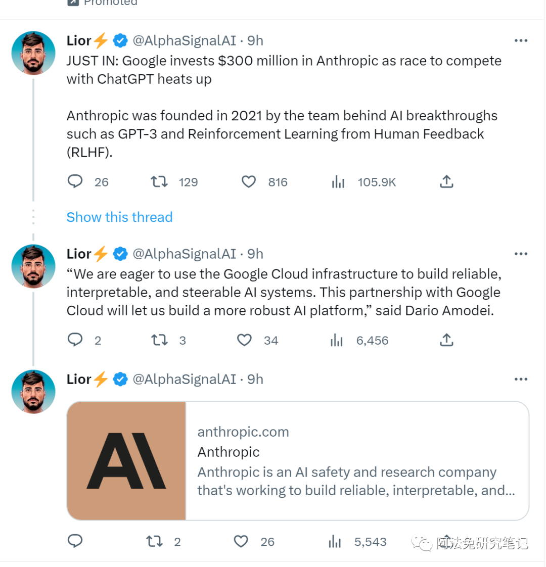 回到今天谷歌投资Anthropic这件事,谷歌管理层一定会担心生成式人工智能在搜索市场能掀起什么样的波浪(可以参考这篇文章重新定义搜索:人工智能+搜索带来的机会),是否真的会对未来的市场造成巨大的影响。https://www.ft.com/content/583ead66-467c-4bd5-84d0-ed5df7b5bf9chttps://stratechery.com/2023/more-on-google-and-ai-openai-integration-and-microsoft/https://venturebeat.com/ai/google-invests-300-million-in-anthropic-as-race-to-compete-with-chatgpt-heats-up/https://www.anthropic.com/news/announcement【阅读更多】
