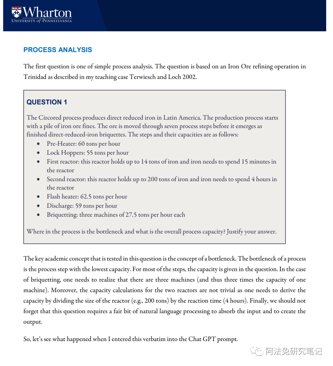 生产过程分析是指要分析生产过程中劳动者的操作程序、人机程序、物流程序。通过分析,改进生产过程的组织管理及其工作方法。教授给ChatGPT出的第一个题目,是一个简单的生产过程分析问题。问题是基于教学案例Terwiesch and Loch 2002所描述的特立尼达岛的铁矿石精炼作业。![]()