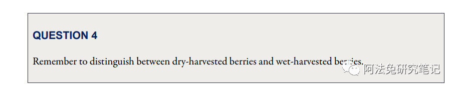 教授给Chatgpt对于这道题回答评了A+...认为这个答案准确并且解释的很好。还有第四题也有意思,"Remember to distinguish between dry-harvested berries and wet-harvested berries."