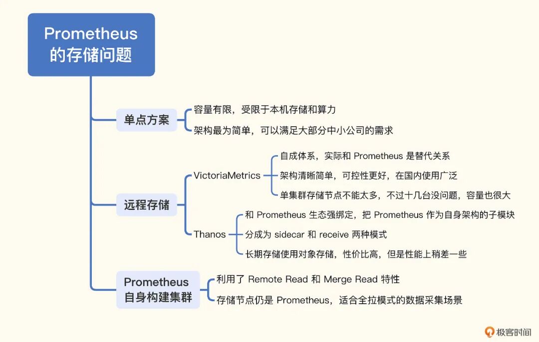 以上我们介绍了 Prometheus 生态常见的存储扩展方案,下面对本讲的内容做一个总结。