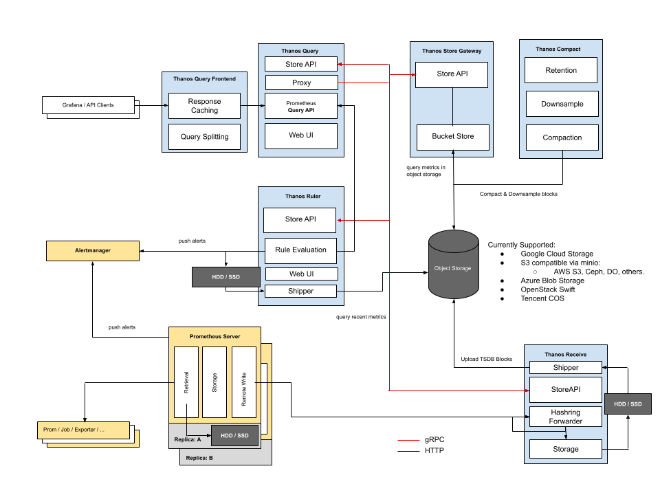 这个架构图初看起来比较复杂,黄色部分是 Prometheus 自身,蓝色部分是 Thanos,黑色部分是存储。这里边有几个核心点。