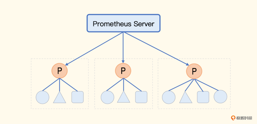 如果单个 Prometheus 实在是扛不住,也可以拆成多个 Prometheus,根据业务或者地域来拆都是可以的,这就是下面要介绍的 Prometheus 联邦机制。