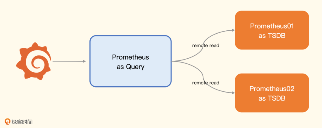 图上有三个 Prometheus 进程,有两个用作存储,有一个用作查询器,用作查询器的 Prometheus 通过 Remote Read 的方式读取后端多个 Prometheus 的数据,通过几行 remote_read 的配置就能实现。
