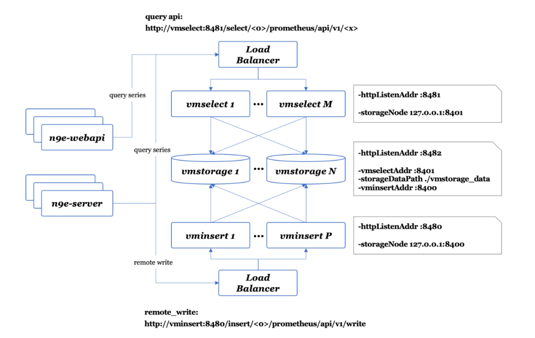 n9e-webapi 通过 vmselect 查询时序数据,vmselect 是无状态模块可以水平扩展,通常部署多个实例,前面架设负载均衡,所以 n9e-webapi 通常是对接 vmselect 的负载均衡。n9e-server 也有一些查询 VM 的需求,先不用关注,重点关注 Remote Write 那条线,n9e-server 通过 Remote Write 协议,把数据转发给 vminsert 的负载均衡,vminsert 也是无状态的,可以水平扩展。