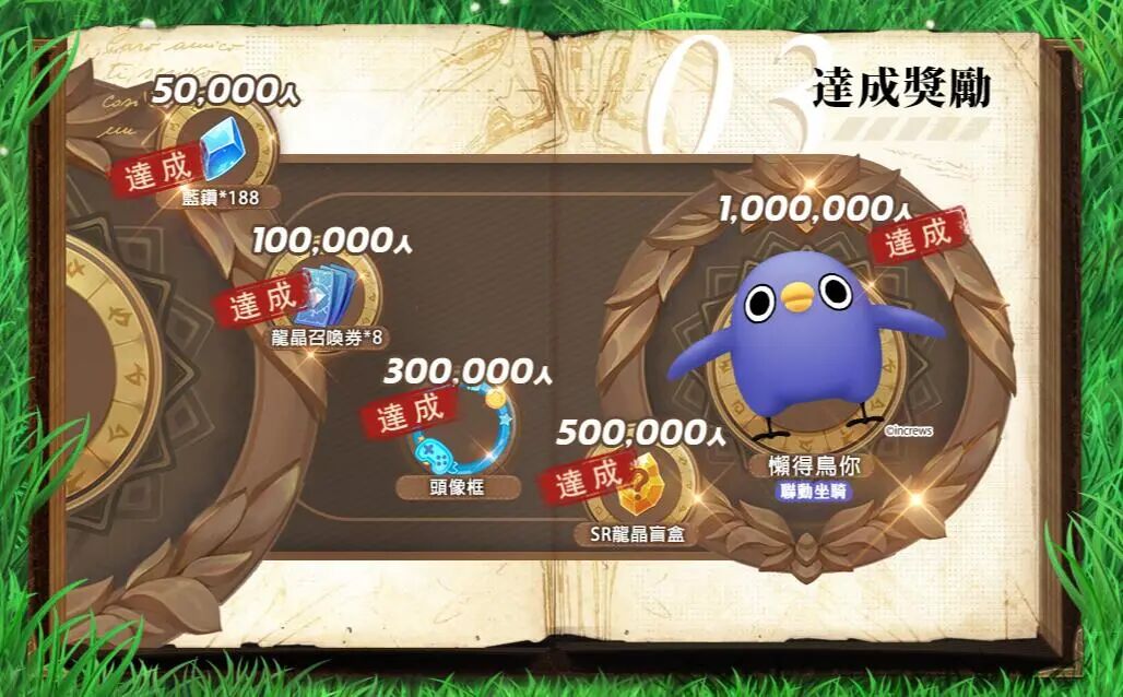 另外值得一提的一个小细节是《卡利兹传说》的预约奖励。预约阶段根据不同预约人数设定不同的里程碑奖励已是新游宣发的基本操作,但《卡利兹传说》的最高里程碑(100万)奖励赠送的则是一个联动宠物——与日本Increws公司推出的萌鸟形象Mentori联动的游戏内宠物。有趣的是,Mentori的中文译名就叫【懒得“鸟”你】,这组联动无疑又正中玩家的萌点,同时也与游戏本身的慵懒治愈相匹配。