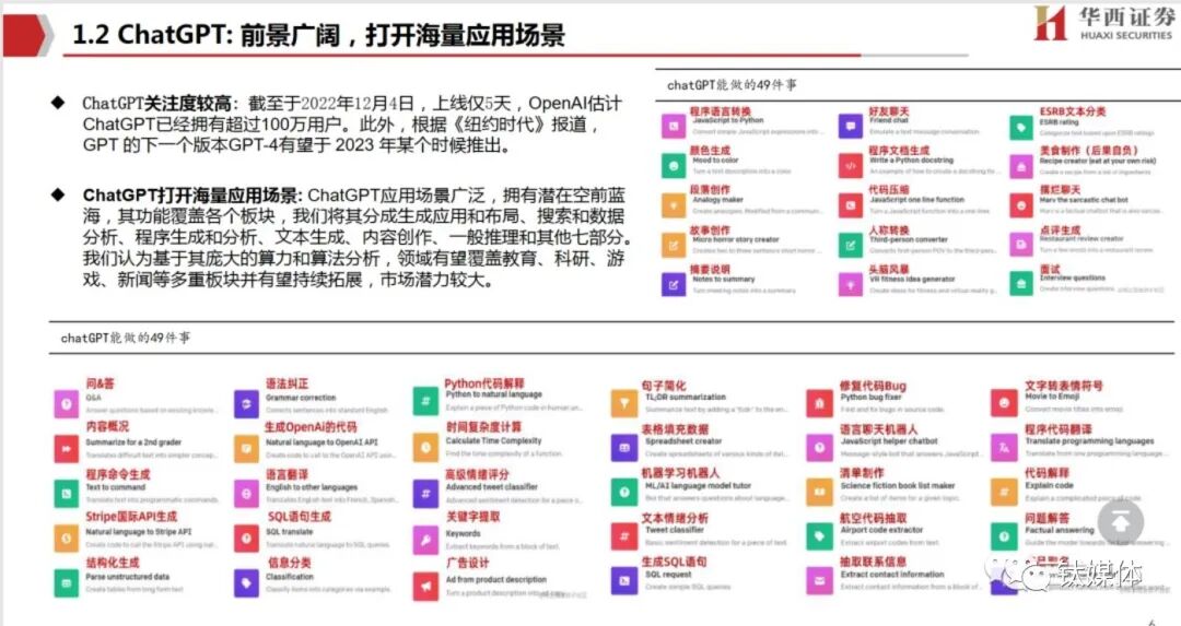 日前,华西证券在ChatGPT相关报告中列出了其能做的49件事。报告还指出,ChatGPT还有望在教育、科研、游戏、新闻等领域不断拓展,前景广阔。