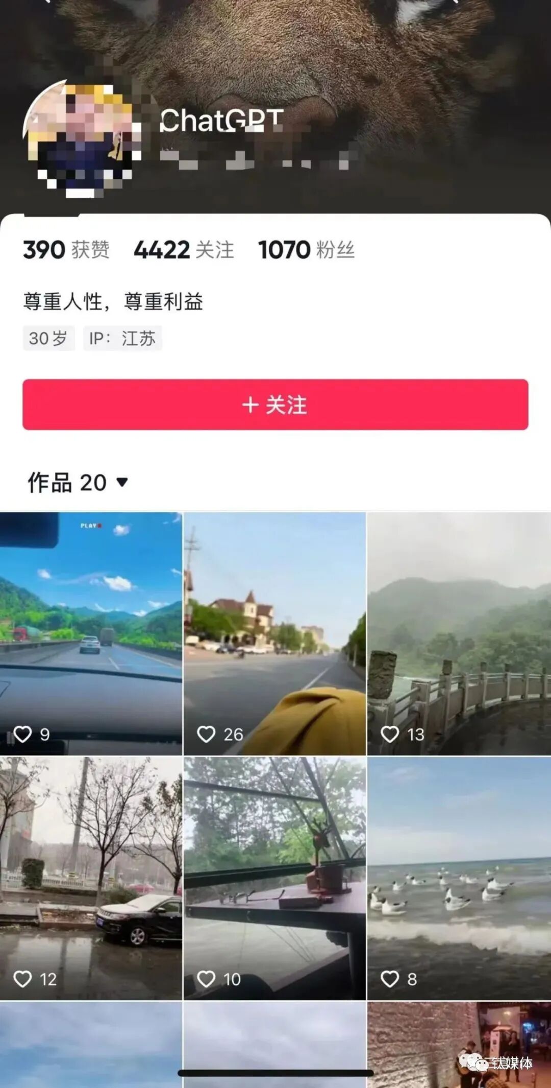 此外,在短视频平台上也能搜到近百个ChatGPT命名的账号,笔者随便点开了几个,发现要不是账号分享的,要不就是纯粹蹭流量,很少有发ChatGPT相关内容的。