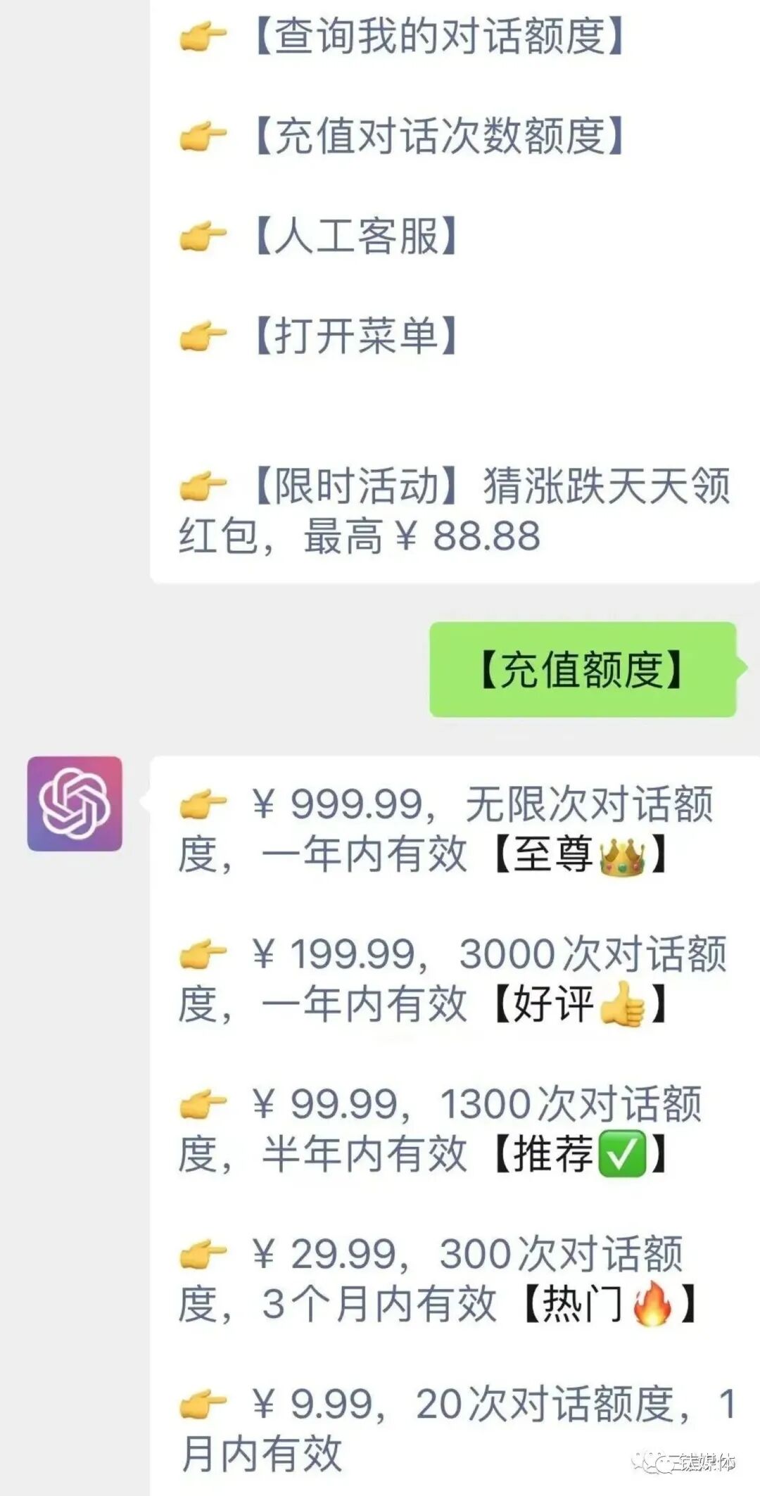 有的公众号还没聊几句,就在聊天窗口提示有限制对话次数,引导用户付费,费用最高甚至高达999元。