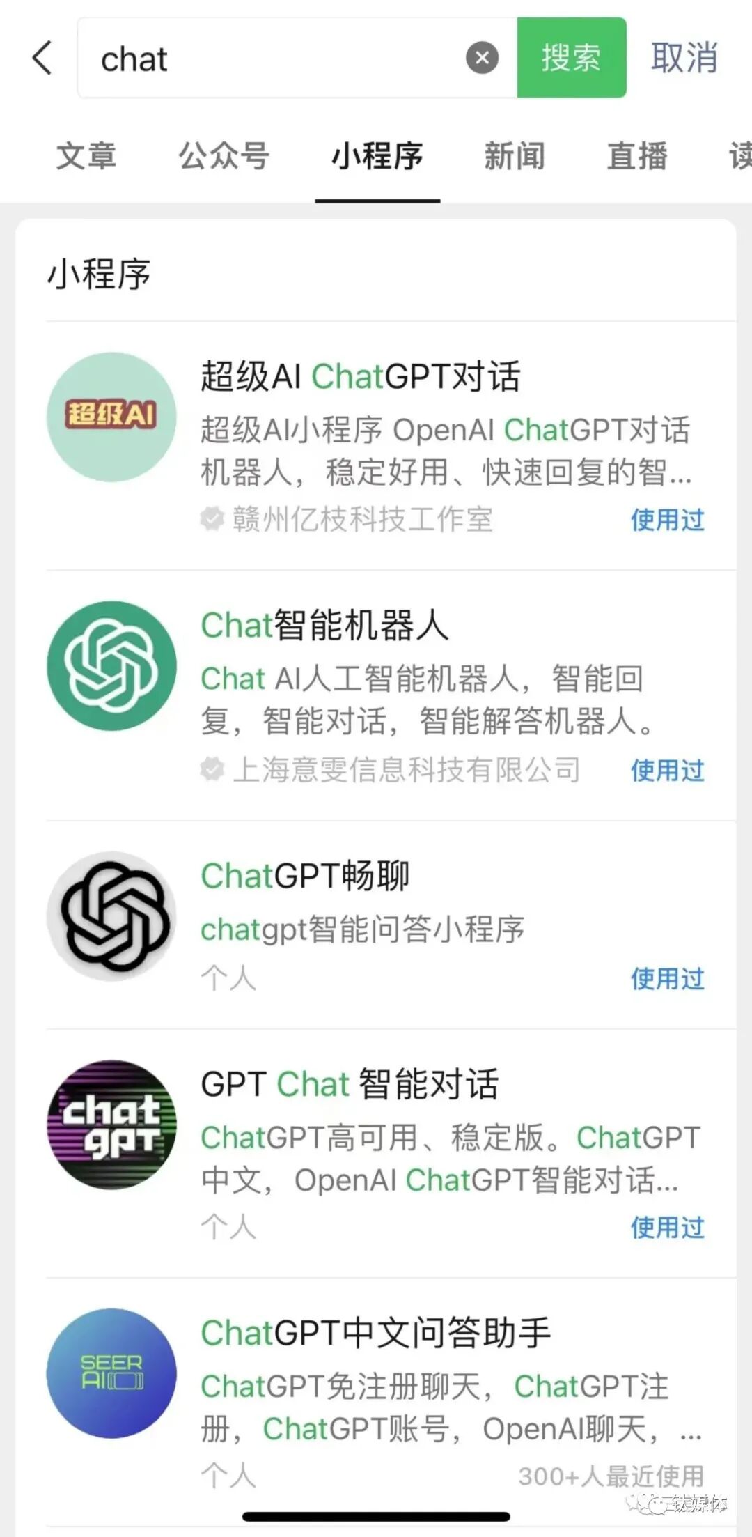 在微信平台,有大量以ChatGPT命名的微信公众号或者小程序,两者加起来得有上百个。