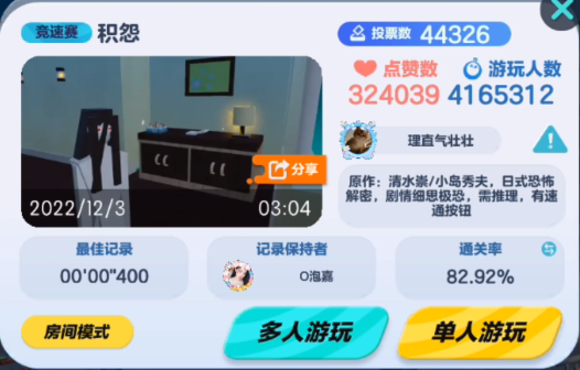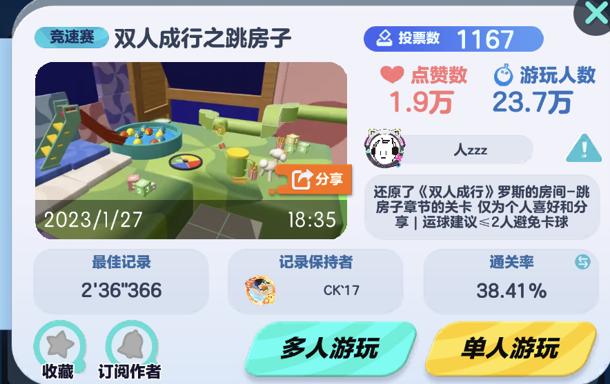 按照游戏机制,每张图发布到乐园后,会接受玩家的品评,玩家可以根据喜好给地图点赞。之后地图的介绍卡上会显示游玩人数、点赞数以及通关率。