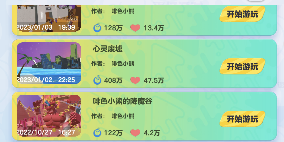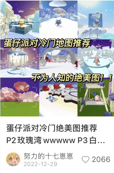 其中在某些方面出众的地图很快出现在各种蛋仔博主的账号上宣传,以这种方式相互快速传播并提高地图的关注度。如今啡色小熊的大部分图都有数百万游玩人次,上万点赞,其中“心灵废墟”点赞就高达47万。