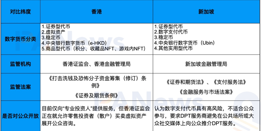 美国对于加密市场的监管政策整体上仍然相对较为成熟,美国芝商所最早上线比特币期货;随后又陆续批准USDC、BUSD等美元稳定币;美国加密交易所Coinbase又率先在美股上市;到了2022年,美国更是推出比特币期货ETF,这些举措整体都深远影响加密市场的发展,并使加密市场开始融入到传统金融市场。由于香港和美国的体制相似,金融业发达,香港此番的加密举措整体上是在美国的成熟经验上进一步深化,进行全面梳理,并逐步实施。2023年1月13日,三星资产管理公司在香港上市「三星比特币期货投资 ETF」,这是第三只加密资产ETF;此前南方东英资产管理有限公司推出的比特币期货ETF、以太坊期货ETF于2022年12月16日在港交所上市交易。另外,2023年1月31日,香港金管局发布的《关于加密资产和稳定币的讨论文件结论》进一步开始明确稳定币监管政策;而后续预计会根据加密市场发展,进一步推出相关加密政策。对比新加坡和香港的数字货币监管政策,在稳定币监管方面,新加坡和香港有很多共同之处,一方面他们都是将其作为数字支付代币或虚拟资产来监管,另一方面新加坡和香港都采取了进一步的措施来监管稳定币,香港将可能结合《支付系统及储值支付工具条例》来进行监管,新加坡打算在《支付服务法》(PSA)下面增加针对稳定币的监管条款。为方便读者进一步了解新加坡和香港的监管政策区别,本文选取PANews整理的一张香港和新加坡的加密监管政策对比图:![]()