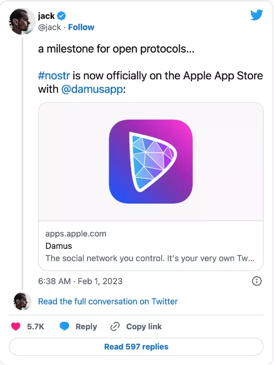 Jack Dorsey 自从离开 Twitter 后一直专注于 Web3 事业。去年 12 月,他曾向 Damus 背后的开放式去中心化社交网络协议 Nostr 捐赠了 14 BTC(约合 25 万美元)。得知 Damus 获批上线后,Jack 立刻在 Twitter 发帖「a milestone for open protocols...(开放协议的一次里程碑)」并附上了 Damus 的下载链接。