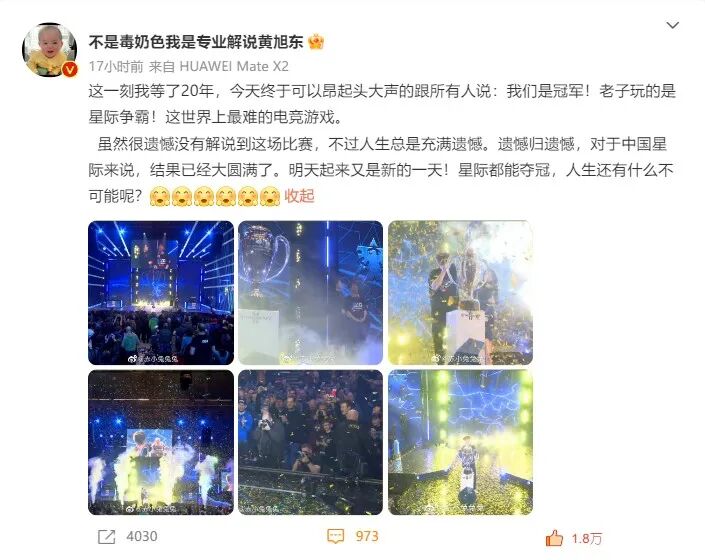 领奖台上的李培楠泣不成声“去年真的很难”,一度以为“‘星际争霸’对我来说已经结束了”。屏幕前的支持者们同样如此,鸟哥在直播间泣不成声,黄旭东、孙一峰、少帮主,无论是支撑着国服“星际争霸”的大哥,还是已经逐渐淡出“星际争霸”的老前辈,都为这位前无古人并有很大可能后无来者的冠军,献上了最为诚挚的祝福。