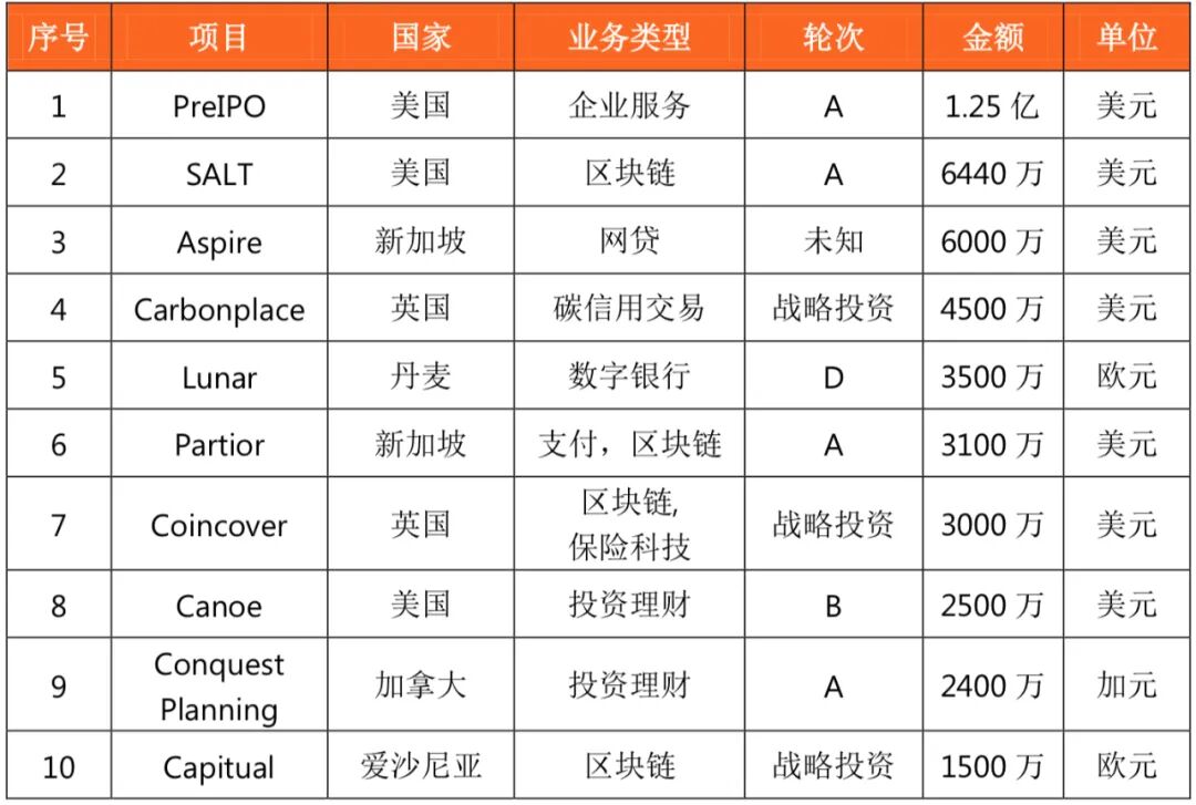 融资额最高的2家公司均来自美国:证券交易白标SaaS产品提供商PreIPO获得1.25亿美元A轮融资,加密借贷平台完成6440万美元A轮融资。其次,SEC文件披露显示,新加坡中小企业在线贷款平台Aspire融资6000万美元。