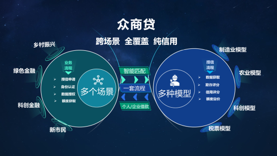 “众商贷”突破单一场景限制,基于经授权的小微企业税务、发票、行业评价等基础经营数据,结合征信、执法、工商、反欺诈、多头借贷等第三方外部数据建立了大数据风控模型,可以为中小微企业、企业主、个体工商户等市场主体解决小额分散、短周期、无抵押、无担保的经营资金需求。