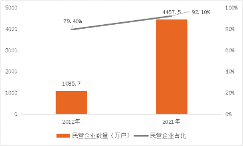 国家市场监督管理总局数据显示,2012年至2021年,民营企业数量从1085.7万户增长到4457.5万户,10年间翻了两番,民营企业在企业总量中的占比由79.4%提高到92.1%,其中,2021年全国新设民营企业852.5万户,同比增长11.7%。