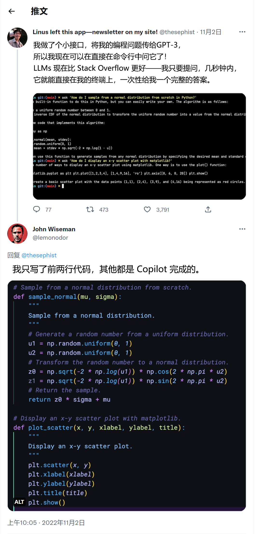 在资本的支持下,软件价值链中的一层在过去几个月里得到了大幅升级。当一个工程师想推进一个大项目时——他们依然在高层级上分析手头的业务任务,并将其分解成更小的子问题——但在最底层的实施时,记住、学习数千种编程语言和框架和其他「咒语一般的东西」,变得容易多了。如果你有「我想把这个数据集变成散点图」之类的想法,对 AI 来说,干这个活儿简直小菜一碟。AI 并不总能做到完美,但起码能做得八九不离十,在这个基础上,人们可以去修正细小的推理错误,也可以根据自己的喜好对其进行调整。这就是互补性:人类擅长推理业务逻辑,但人类的大脑并不擅长记忆数量庞大的实施细节。因此,Copilot 不仅会提高单个程序员的生产力,还会创造出更多的程序员。