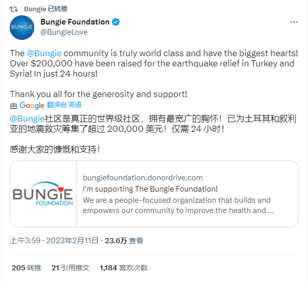 2月11日,Bungie官方基金会在推特上宣布,他们在24小时内就筹集到了超过20万美金,连连感谢玩家们的慷慨支持。Bungie承诺,所有来自玩家的捐款都将直接送给慈善组织,为受灾民众提供食物、住所和医疗用品等即时援助。