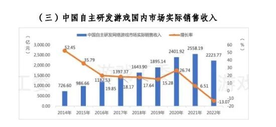 -中国自主研发游戏国内市场实际销售收入2223.77 亿元,同比下降13.07%。