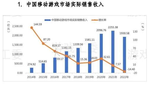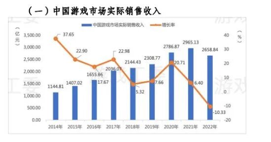 -2022年中国游戏市场实际销售收入2658.84亿元,同比下降10.33%。
