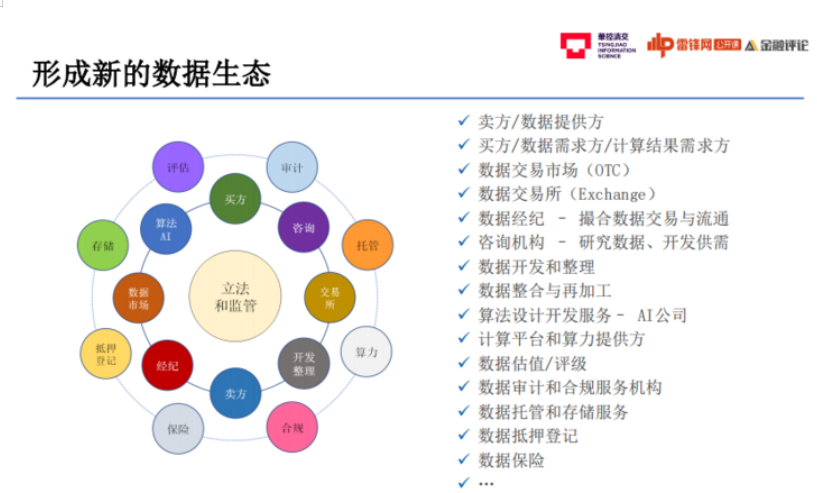 华控清交绘制了一张数据生态图(如下),描述了未来即将形成的新的数据生态。未来,围绕数据价值的挖掘,会形成数据交易市场、交易所、数据经纪和咨询机构等等所组成的新生态。