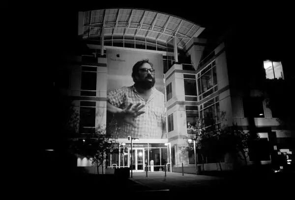 2000 年 4 月,Infinite Loop 大楼外挂着的「Think Different」广告画,图自 《连线》