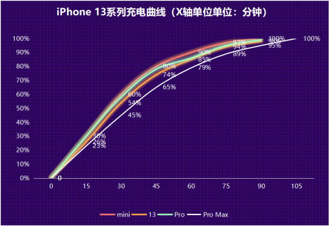 iPhone 13 mini电池容量较小,90分钟内就完全充满了,iPhone 13和iPhone 13 Pro电池容量差不多,100分内可以充满,iPhone 13 Pro Max则需要105分钟才能完全充满。