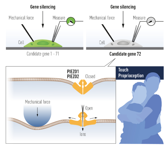帕塔普蒂安与合作者们首先鉴定出了一种细胞系,当用微量移液头戳中单个细胞时,它们都会发出一个可测量的电信号。他们首先假设被机械力激活的受体是一种离子通道受体,随后识别出编码该受体的 72 个候选基因。他们通过将细胞中这些基因一一沉默,以寻找在这个细胞系中负责感知机械力的基因。经过一段艰苦的研究过程,帕塔普蒂安和同事们成功地确定了一个基因,当它被沉默之后,细胞对微量移液头的戳刺不再敏感。自此,他们发现了一种全新的、对机械力敏感的离子通道,并以希腊语中表示“压力”的词汇,将其命名为 Piezo1。他们还发现了一个与Piezo1相似的基因,并将其命名为Piezo2,它在感觉神经元中处于高表达水平。通过进一步研究,他们证实 Piezo1 和 Piezo2 是离子通道受体,对细胞膜施加压力可直接激活这两种受体。