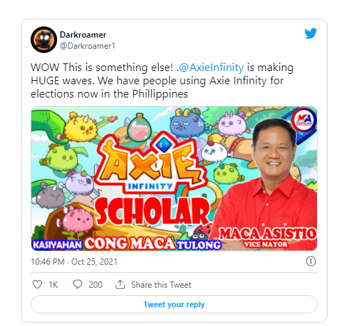 随着越来越多的人把元宇宙作为就业和收入的来源,花越来越多的时间与加密生态互动,生态系统的交互性就会呈几何态势继续增长。现在,你甚至还可以利用该生态来参与选举,是的,比推此前报道, 委内瑞拉北部的一位州长候选人承诺为 Axie Infinity提供一个学习中心,让当地人能够有更多的就业机会,以此来拉选票。这还不是唯一的例子,菲律宾也有官员直接用 Axie 作为自己的特色作为参选筹码。