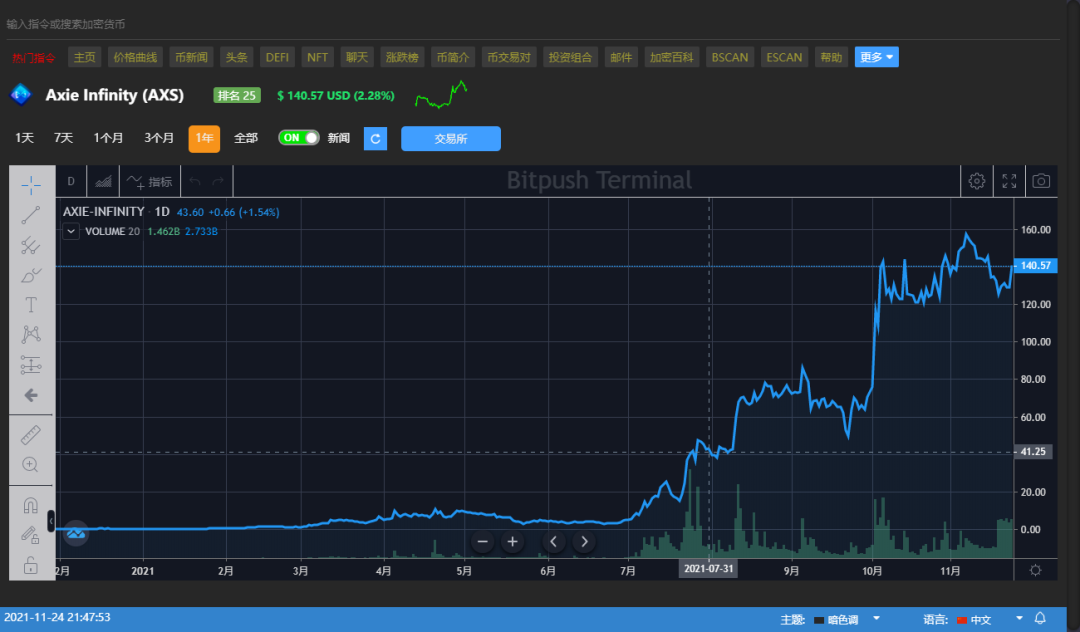 AxieInfinity的AXS代币的价格一直都是最能迷惑人心智的东西。AXS于2020年11月首次在币安交易所上市,初始价格约为11美分,对于那些在当时拥有一些AXS并持有到现在的长期投资者来说,总回报率高达1318倍。根据比推终端数据显示,截至发稿为止,Axie 的价格为 140.56 美元。很多人认为一年内翻了千倍的东西肯定是存在严重泡沫的。