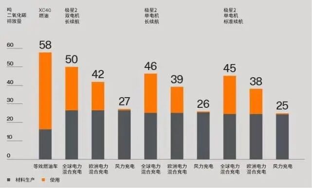 以极星2双电机长续航版为例,在采用全球电力混合充电的环境下,其材料生产和使用环节产生二氧化碳排放量为50吨。在欧洲电力混合充电条件下,产生42吨二氧化碳排放量。如果采用风力充电,仅产生27吨二氧化碳排放,这意味着,在使用环节的排放几乎接近零。