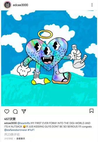 9 月 23 日,演员兼歌手、潮流品牌 CLOT 创始人陈冠希在个人社交平台 Instagram 上分享了一幅 NFT 收藏品项目 The Heart Project 的 NFT 作品,并附文:初次尝试进入数字世界。
