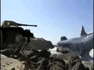 在这部“鲨雕”影片中,鲨鱼学会了上岸,然后大战美国小姐、大战美国大兵、大战美国战斗机,最后大战美国坦克,很神。
