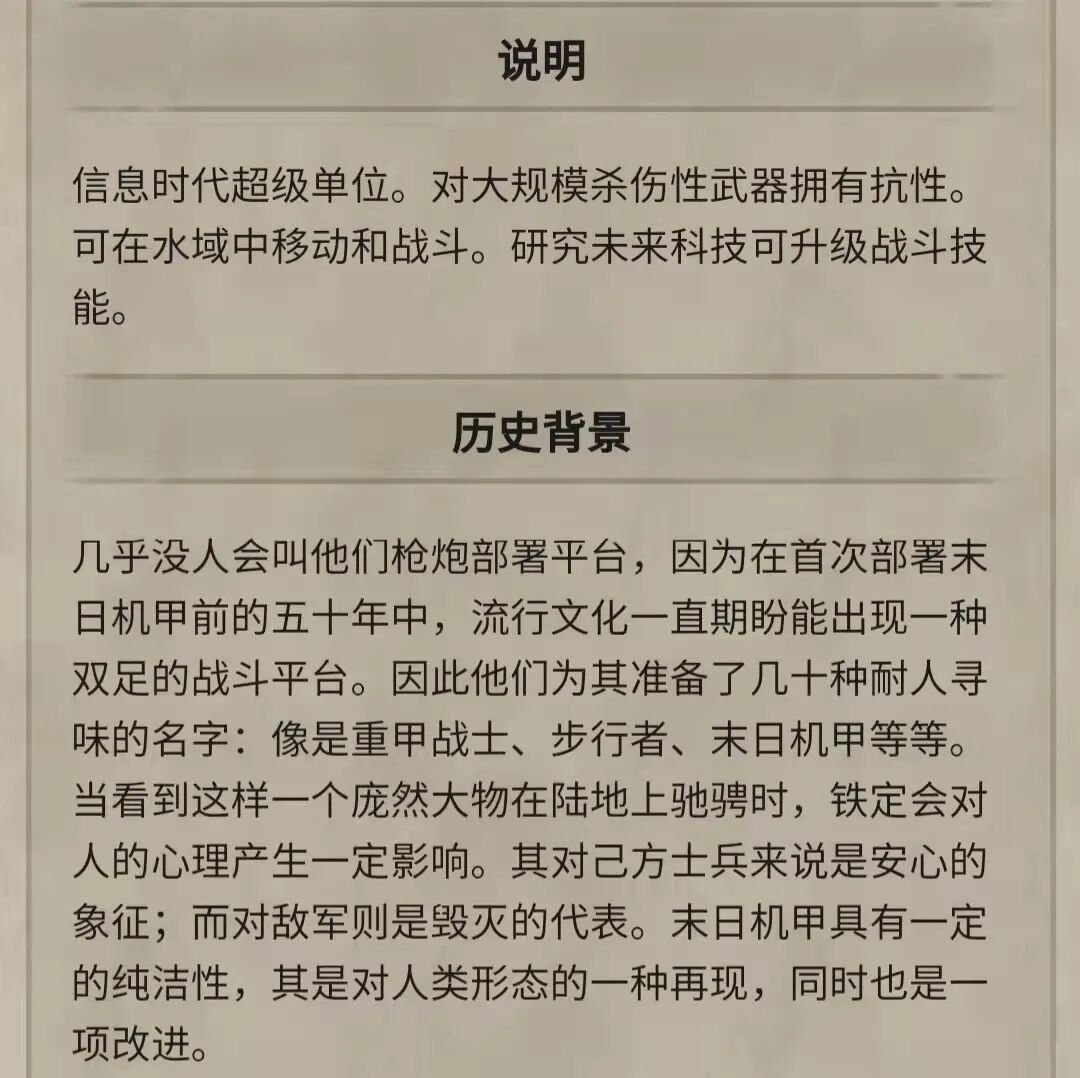 在《文明6》中,所有文明的顶级陆地战斗单位都是“末日机甲”,这是一种两条腿的巨大机器人。如果你打开末日机甲的百科,就会看到上面有说:流行文化一直期盼能出现一种双足的战斗平台……末日机甲具有一定纯洁性,其是对人类形态的一种再现……