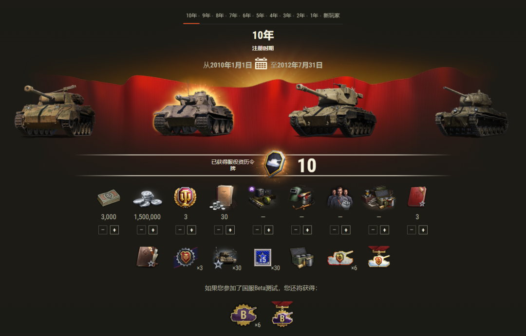而本此《坦克世界》的当之无愧奖,就会根据玩家自身帐号年限,发放相应奖励。只要是在11月23日前创建《坦克世界》帐号的玩家,在今天之后登陆游戏,未来一年都可以认领奖品。