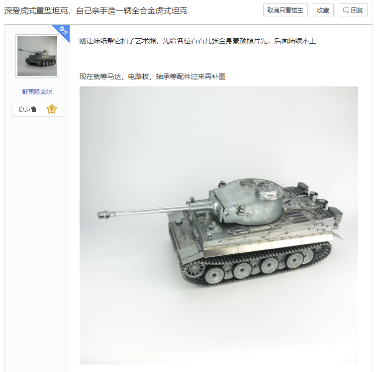 因为深爱着《坦克世界》中的虎式坦克,也会有玩家历时一个多月,打造一辆全合金模型,并且加入前置双LED大灯、炮管升降、可活动的挡泥板、前驱轮负重轮导向轮和独立悬挂系统,甚至冒烟模拟装置。