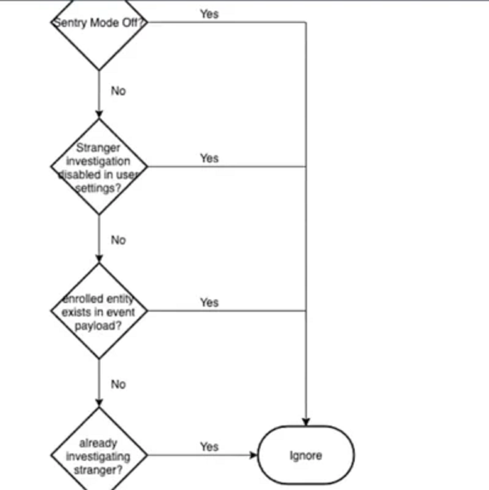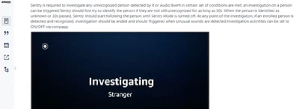 Vesta移动到预先确定的用户住所内扫描点,然后调整姿势开始扫描房间,查看路过和前进途中的障碍物。当Vesta移动过用户住所平面扫描图上所有扫描点后,Vesta就完成了一次完整的巡逻。内部文件提到如果机器人检测到它认为不寻常的东西,例如看到一个无法识别的人时,或者听到像玻璃破碎或火警报警器报警声一样的声音时,它将进一步进行调查,包括跟踪不明身份的人绕屋子移动。开启Sentry模式后,Astro机器人被设置成,应该首先尝试识别监测到的人,如果30秒后,还识别为不明身份的人,Astro机器人开始跟踪此人,直到Sentry模式被关闭。亚马逊Astro机器人软件开发会议上展示的流程图准确地解释了当Astro机器人探测到一个“presence(感觉在附近的人)”时会发生什么,以及研究人员是如何设计Astro机器人来“stranger investigation(调查陌生人)”的。![]()