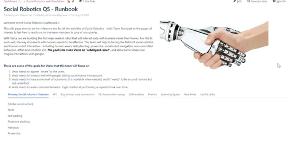 Astro机器人应该随着时间的推移而学习,这意味着它必须跟踪人类在做什么,他们要去哪里,以及他们可能聚集在哪里。一位Vesta项目的开发人员说:“设备中的移动能力需要完美实现。我在这里说完美,因为如果它不能完美地实现,我们就不能指望社交机器人(在人们的家中)受到欢迎。”为了做到完美,Astro机器人必须“在用户面前显得‘聪明’”,“需要与人良好互动,考虑到社会规范”,需要跟踪并从客户行为中学习,“需要有一定程度的自主权,人们需要的时候是可用的,Astro机器人‘希望’在人类周围,但不碍事”。施密特告诉Motherboard:“我们设计Astro机器人来控制设备上的大量数据处理,包括它在家中移动时能处理图像和原始传感器数据,这有助于Astro机器人对环境做出快速反应。此外,你的视觉ID数据被存储在设备上,Astro机器人通过基于设备的数据处理来识别你。”亚马逊的程序员在一次会议上还提到,他们已经确定了Astro机器人与用户互动的最佳距离。例如,在大多数情况下,它应该是“社交距离”,即距离用户1到1.5米。然而,当用户从亚马逊购买东西时,Astro机器人知道(屏幕)需求处于可查看状态,此时,Astro机器人靠近用户,两者之间距离缩小为40厘米。
