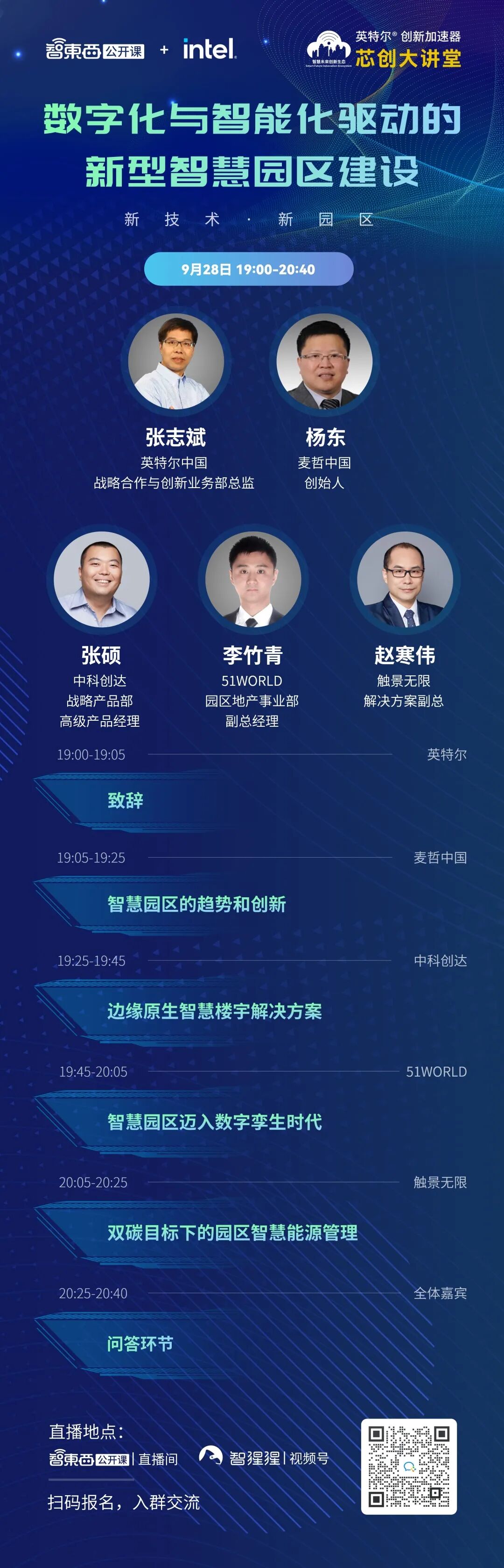 9月28日晚7点,英特尔创新加速器·芯创大讲堂联合智东西公开课策划推出的智慧园区专场将线上开讲。本次专场主题为“新技术 新园区”。目前专场已经邀请到英特尔中国战略合作与创新业务部总监张志斌、麦哲中国创始人杨东、中科创达战略产品部高级产品经理张硕、51WORLD园区地产事业部副总经理李竹青、触景无限解决方案副总赵寒伟五位嘉宾参与。他们将围绕“数字化与智能化驱动的新型智慧园区建设”这一议题进行分享。